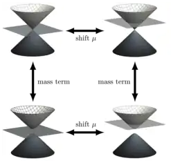 qui contient maintenant un terme de masse . Il existe plusieurs façons distinctes d'introduire un terme de masse, et les résultats ont des caractéristiques différentes[8],[9]. L'approche la plus pratique pour créer un écart (en introduisant un terme de masse) consiste à briser la symétrie sous-réseau du réseau où chaque atome de carbone est légèrement différent de ses plus proches voisins mais identique à ses voisins les plus proches suivants ; un effet qui peut résulter des effets du substrat.