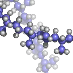 - les polyamides (PA) (connus sous le nom de nylon[5]) sont sortis des éprouvettes du chimiste américain Wallace Hume Carothers travaillant pour Du Pont de Nemours[6]. En 1938, la firme annonce officiellement la découverte d'une fibre synthétique « aussi solide que l'acier, aussi fine que la toile d'araignée, et d'un magnifique éclat ». Ce fut le premier plastique technique à haute performance, avec en particulier un coefficient de friction faible. Applications : fait ses preuves dans les parachutes des G.I. au moment du Débarquement, puis utilisé dans la confection de bas ; engrenages, cages de roulement à billes, corps de perceuse, têtes de maillet, visserie plastique, semelles de chaussures de football ;