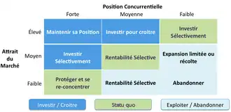 La matrice McKinsey est une matrice de décision stratégique développée par le cabinet de conseil McKinsey & Company, où chaque DAS (Domaine d'activité stratégique) est analysé à partir de deux dimensions : l’attrait du marché (pour l'entreprise devant prendre une décision) et la position concurrentielle.