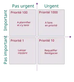 La matrice d'Eisenhower est un outil d'analyse et de gestion du temps qui permet de classer les tâches à faire en fonction de leur urgence ainsi que de leur importance[1].