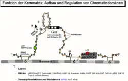Les preuves de l'existence d'une telle structure ont été apportées dès 1948 (Zbarskii et Debov) et, par conséquent, de nombreuses protéines associées à la matrice ont été découvertes. La présence de protéines intra-cellulaires est largement indiscutable et on sait bien que les protéines telles que les SARs ou MARs jouent un certain rôle dans l'organisation de la chromatine - ↑ (en) Tetko IV, Haberer G, Rudd S, Meyers B, Mewes HW, Mayer KF, « Spatiotemporal expression control correlates with intragenic scaffold matrix attachment regions (S/MARs) in Arabidopsis thaliana », PLoS Comput. Biol., vol. 2, no 3, , e21 (PMID 16604187, PMCID 1420657, DOI 10.1371/journal.pcbi.0020021)