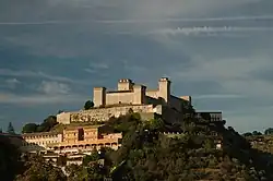 - Mais son œuvre la plus importante fut la forteresse de Spolète (Rocca Albornoziana), une construction remarquable qui marie la puissance de l'art militaire et le somptueux d'une résidence royale. Gregorovius l'estima comme le plus beau monument du Moyen Âge[1].