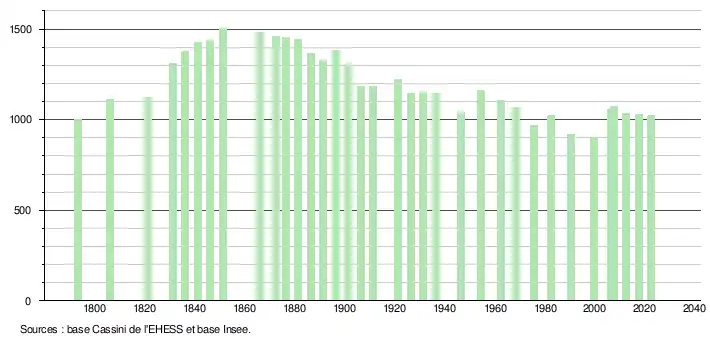 L'évolution du nombre d'habitants est connue à travers les recensements de la population effectués dans la commune depuis 1793. Pour les communes de moins de 10 000 habitants, une enquête de recensement portant sur toute la population est réalisée tous les cinq ans, les populations de référence des années intermédiaires étant quant à elles estimées par interpolation ou extrapolation[30]. Pour la commune, le premier recensement exhaustif entrant dans le cadre du nouveau dispositif a été réalisé en 2007[31].