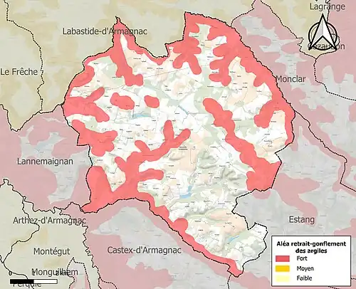 Le retrait-gonflement des sols argileux est susceptible d'engendrer des dommages importants aux bâtiments en cas d’alternance de périodes de sécheresse et de pluie. 37,6 % de la superficie communale est en aléa moyen ou fort (94,5 % au niveau départemental et 48,5 % au niveau national). Sur les 193 bâtiments dénombrés sur la commune en 2019, 32 sont en aléa moyen ou fort, soit 17 %, à comparer aux 93 % au niveau départemental et 54 % au niveau national. Une cartographie de l'exposition du territoire national au retrait gonflement des sols argileux est disponible sur le site du BRGM[25],[Carte 3].