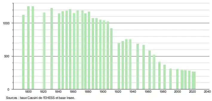 L'évolution du nombre d'habitants est connue à travers les recensements de la population effectués dans la commune depuis 1793. Pour les communes de moins de 10 000 habitants, une enquête de recensement portant sur toute la population est réalisée tous les cinq ans, les populations de référence des années intermédiaires étant quant à elles estimées par interpolation ou extrapolation[29]. Pour la commune, le premier recensement exhaustif entrant dans le cadre du nouveau dispositif a été réalisé en 2005[30].