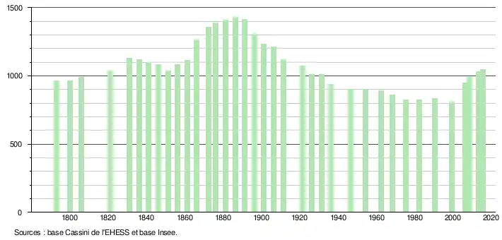 L'évolution du nombre d'habitants est connue à travers les recensements de la population effectués dans la commune depuis 1793. Pour les communes de moins de 10 000 habitants, une enquête de recensement portant sur toute la population est réalisée tous les cinq ans, les populations de référence des années intermédiaires étant quant à elles estimées par interpolation ou extrapolation[7]. Pour la commune, le premier recensement exhaustif entrant dans le cadre du nouveau dispositif a été réalisé en 2008[8].
