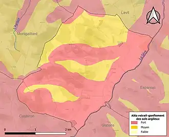 Le retrait-gonflement des sols argileux est susceptible d'engendrer des dommages importants aux bâtiments en cas d’alternance de périodes de sécheresse et de pluie. La totalité de la commune est en aléa moyen ou fort (92 % au niveau départemental et 48,5 % au niveau national). Sur les 24 bâtiments dénombrés sur la commune en 2019, 24 sont en aléa moyen ou fort, soit 100 %, à comparer aux 96 % au niveau départemental et 54 % au niveau national. Une cartographie de l'exposition du territoire national au retrait gonflement des sols argileux est disponible sur le site du BRGM[22],[Carte 3].