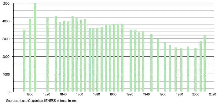 - ↑ Par convention dans Wikipédia, le principe a été retenu de n’afficher dans le tableau des recensements et le graphique, pour les populations légales postérieures à 1999, que les populations correspondant à une enquête exhaustive de recensement pour les communes de moins de 10 000 habitants, et que les populations des années 2006, 2011, 2016, etc. pour les communes de plus de 10 000 habitants, ainsi que la dernière population légale publiée par l’Insee pour l'ensemble des communes.