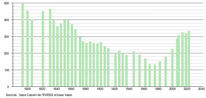 L'évolution du nombre d'habitants est connue à travers les recensements de la population effectués dans la commune depuis 1793. Pour les communes de moins de 10 000 habitants, une enquête de recensement portant sur toute la population est réalisée tous les cinq ans, les populations de référence des années intermédiaires étant quant à elles estimées par interpolation ou extrapolation[26]. Pour la commune, le premier recensement exhaustif entrant dans le cadre du nouveau dispositif a été réalisé en 2008[27].
