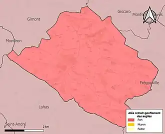 Le retrait-gonflement des sols argileux est susceptible d'engendrer des dommages importants aux bâtiments en cas d’alternance de périodes de sécheresse et de pluie. La totalité de la commune est en aléa moyen ou fort (94,5 % au niveau départemental et 48,5 % au niveau national). Sur les 133 bâtiments dénombrés sur la commune en 2019, 133 sont en aléa moyen ou fort, soit 100 %, à comparer aux 93 % au niveau départemental et 54 % au niveau national. Une cartographie de l'exposition du territoire national au retrait gonflement des sols argileux est disponible sur le site du BRGM[18],[Carte 3].