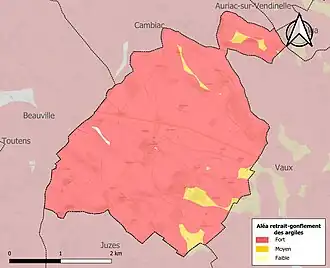 Le retrait-gonflement des sols argileux est susceptible d'engendrer des dommages importants aux bâtiments en cas d’alternance de périodes de sécheresse et de pluie. 99,8 % de la superficie communale est en aléa moyen ou fort (88,8 % au niveau départemental et 48,5 % au niveau national). Sur les 97 bâtiments dénombrés sur la commune en 2019, 96 sont en aléa moyen ou fort, soit 99 %, à comparer aux 98 % au niveau départemental et 54 % au niveau national. Une cartographie de l'exposition du territoire national au retrait gonflement des sols argileux est disponible sur le site du BRGM[23],[Carte 3].