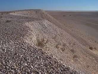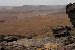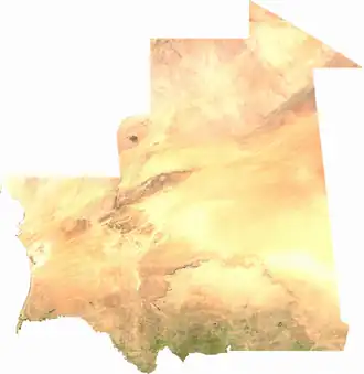 D'une superficie de 1 036 000 km2[11], la Mauritanie compte au centre et au nord un relief constitué par les massifs montagneux du Kedia d'Idjil, des Mauritanides, du Tagant et de l’Adrar qui culminent à 400 et 500 mètres. Les parties les plus hautes sont, en général, constituées de roches dures qui forment des falaises abruptes. À l’exception de la plaine alluviale du Sénégal, appelée Chemama (en), large de 10 à 25 kilomètres, assez peuplée (villes de Rosso et Kaédi), le reste du pays est constitué en grande partie d’alignements dunaires tels ceux de la grande région de sable qui s’étend à l’Est du Tagant et de l’Adrar.