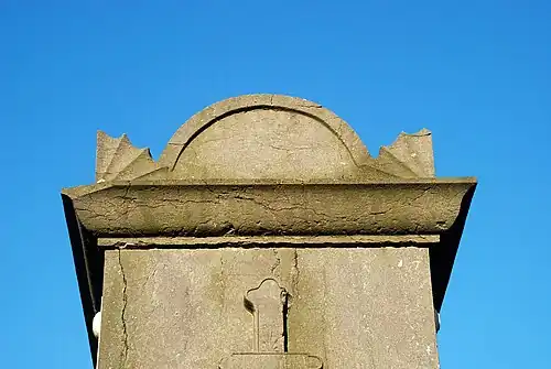 Le monument est couronné d'une corniche moulurée surmontée de frontons courbes et d'acrotères.