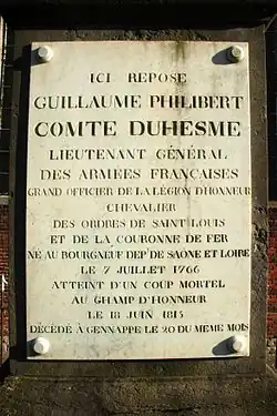 Duhesme est un des rares militaires parmi les 38 000 tombés dans les batailles de Waterloo, Ligny, Quatre Bras (Genappe) et Wavre à avoir reçu une sépulture à proximité du champ de bataille : il n'existe en effet aucun cimetière militaire aux alentours.