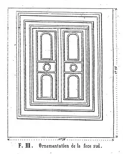 Une porte, à l'origine fermée par une dalle de pierre scellée qui a disparu, s'ouvre sur la face nord du mausolée. Au-dessus de cette porte, une plaque de marbre disparue figurait sans doute la dédicace du mausolée[17]. Chacun des trois autres murs est flanqué d'une fausse porte en marbre blanc[15], encadrée d'un chambranle à nervures, portant des croix gammées entourées d'un cercle[16].