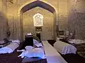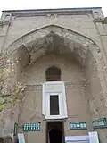 Un grand iwan donne accès à l'édifice surmonté d'un dôme et flanqué de petites tourelles (trois de chaque côté et deux plus hautes de chaque côté de la façade et de l'arrière).