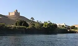 Inspiré de l'architecture fatimide du Caire, le mausolée de calcaire rose surplombe la ville d'Assouan sur la rive gauche du Nil, face à la ville[3].