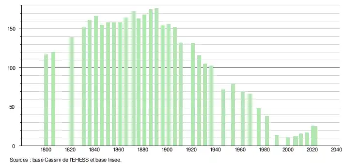 L'évolution du nombre d'habitants est connue à travers les recensements de la population effectués dans la commune depuis 1800. Pour les communes de moins de 10 000 habitants, une enquête de recensement portant sur toute la population est réalisée tous les cinq ans, les populations de référence des années intermédiaires étant quant à elles estimées par interpolation ou extrapolation[8]. Pour la commune, le premier recensement exhaustif entrant dans le cadre du nouveau dispositif a été réalisé en 2005[9].