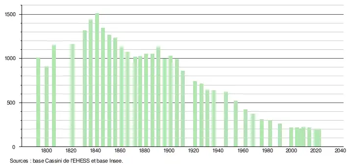 L'évolution du nombre d'habitants est connue à travers les recensements de la population effectués dans la commune depuis 1793. Pour les communes de moins de 10 000 habitants, une enquête de recensement portant sur toute la population est réalisée tous les cinq ans, les populations de référence des années intermédiaires étant quant à elles estimées par interpolation ou extrapolation[18]. Pour la commune, le premier recensement exhaustif entrant dans le cadre du nouveau dispositif a été réalisé en 2004[19].