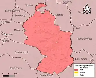 Le retrait-gonflement des sols argileux est susceptible d'engendrer des dommages importants aux bâtiments en cas d’alternance de périodes de sécheresse et de pluie. La totalité de la commune est en aléa moyen ou fort (94,5 % au niveau départemental et 48,5 % au niveau national). Sur les 1 076 bâtiments dénombrés sur la commune en 2019, 1 065 sont en aléa moyen ou fort, soit 99 %, à comparer aux 93 % au niveau départemental et 54 % au niveau national. Une cartographie de l'exposition du territoire national au retrait gonflement des sols argileux est disponible sur le site du BRGM[23],[Carte 3].