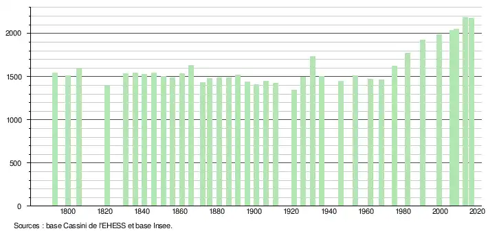 L'évolution du nombre d'habitants est connue à travers les recensements de la population effectués dans la commune depuis 1793. Pour les communes de moins de 10 000 habitants, une enquête de recensement portant sur toute la population est réalisée tous les cinq ans, les populations de référence des années intermédiaires étant quant à elles estimées par interpolation ou extrapolation[4]. Pour la commune, le premier recensement exhaustif entrant dans le cadre du nouveau dispositif a été réalisé en 2008[5].