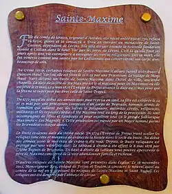 - ↑ Panneau situé dans l'église de Sainte-Maxime, consulté le 11 mai 2018.