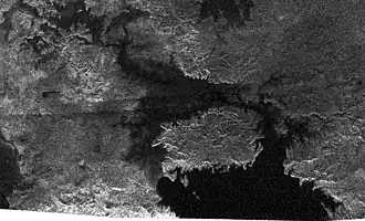 L'imagerie radar à synthèse d'ouverture (SAR) de la sonde Cassini a permis d'identifier en été 2005 près du pôle sud de Titan la première surface plane — en l'occurrence, celle du lac Ontario — interprétée comme celle d'une étendue liquide de méthane et d'éthane, des hydrocarbures légers[6]. Le spectromètre cartographe infrarouge et visible (VIMS) de Cassini a permis par la suite de préciser la nature de cette surface et d'établir qu'il s'agit bien de méthane liquide mélangé à de l'éthane et d'autres hydrocarbures légers, ainsi qu'à de l'azote liquide[7]. Depuis, la plupart de ces lacs ont été repérés près du pôle nord de l'astre[8], où ils ne seraient peut-être pas permanents mais migreraient d'un pôle à l'autre au gré des saisons, voire en un cycle de 45 000 ans[9].