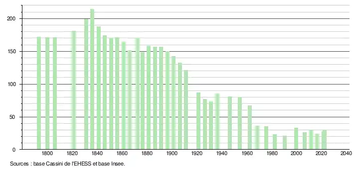 L'évolution du nombre d'habitants est connue à travers les recensements de la population effectués dans la commune depuis 1793. Pour les communes de moins de 10 000 habitants, une enquête de recensement portant sur toute la population est réalisée tous les cinq ans, les populations de référence des années intermédiaires étant quant à elles estimées par interpolation ou extrapolation[35]. Pour la commune, le premier recensement exhaustif entrant dans le cadre du nouveau dispositif a été réalisé en 2006[36].