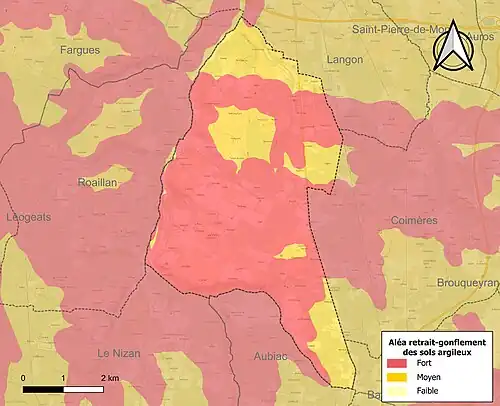 Le retrait-gonflement des sols argileux est susceptible d'engendrer des dommages importants aux bâtiments en cas d’alternance de périodes de sécheresse et de pluie. La totalité de la commune est en aléa moyen ou fort (67,4 % au niveau départemental et 48,5 % au niveau national). Sur les 320 bâtiments dénombrés sur la commune en 2019, 320 sont en aléa moyen ou fort, soit 100 %, à comparer aux 84 % au niveau départemental et 54 % au niveau national. Une cartographie de l'exposition du territoire national au retrait gonflement des sols argileux est disponible sur le site du BRGM[22],[Carte 2].