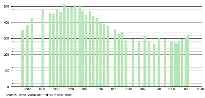 L'évolution du nombre d'habitants est connue à travers les recensements de la population effectués dans la commune depuis 1793. Pour les communes de moins de 10 000 habitants, une enquête de recensement portant sur toute la population est réalisée tous les cinq ans, les populations de référence des années intermédiaires étant quant à elles estimées par interpolation ou extrapolation[21]. Pour la commune, le premier recensement exhaustif entrant dans le cadre du nouveau dispositif a été réalisé en 2004[22].