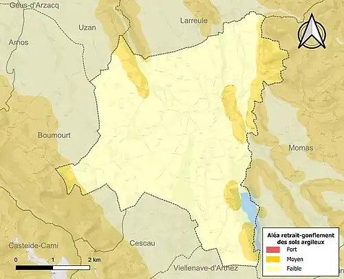 Le retrait-gonflement des sols argileux est susceptible d'engendrer des dommages importants aux bâtiments en cas d’alternance de périodes de sécheresse et de pluie[28]. 15,7 % de la superficie communale est en aléa moyen ou fort (59 % au niveau départemental et 48,5 % au niveau national)[Carte 3]. Depuis le , en application de la loi ELAN, différentes contraintes s'imposent aux vendeurs, maîtres d'ouvrages ou constructeurs de biens situés dans une zone classée en aléa moyen ou fort[Note 5],[29].