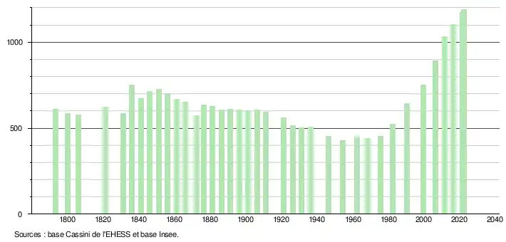 L'évolution du nombre d'habitants est connue à travers les recensements de la population effectués dans la commune depuis 1793. Pour les communes de moins de 10 000 habitants, une enquête de recensement portant sur toute la population est réalisée tous les cinq ans, les populations de référence des années intermédiaires étant quant à elles estimées par interpolation ou extrapolation[40]. Pour la commune, le premier recensement exhaustif entrant dans le cadre du nouveau dispositif a été réalisé en 2006[41].