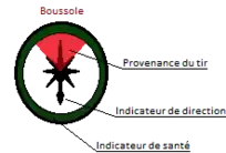Dans le coin inférieur gauche de l'ATH se trouve une boussole servant d'indicateur de direction. Cette boussole est entourée d'un anneau servant d'indicateur de santé, lequel se resserre et passe du vert au rouge à mesure que le joueur subit des dégâts. Une icône triangulaire rouge sur le quadrant de la boussole indique la provenance du tir ennemi. Pour régénérer l'état de santé, le joueur doit récupérer nourritures, fioles et trousses qui guérissent entre 10 et 75 % de la santé totale[m 5]. Quant au coin inférieur droit de l'ATH, il indique le nombre de grenades et munitions restantes.