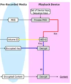 Les disques (Blu-Ray ou HD-DVD) contiennent le contenu chiffré (habituellement une vidéo), l'identificateur de volume appelé VID (Volume ID), les Encrypted Title Key et la clé de déchiffrement, c'est-à-dire, la MKB. Cette dernière est chiffrée aussi pour éviter qu'elle puisse être extraite du disque et être manipulée et/ou reproduite par un autre dispositif non autorisé.