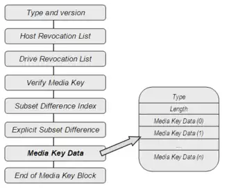 Bien que de fonctionnement soit apparemment simple, la clé MKB (qui se trouve dans le support physique des contenus protégés) suit une structure complexe. Celle-ci est distribuée en blocs, dans laquelle est définie la version de la clé, la liste des dispositifs qui ont été révoqués, un champ pour confirmer la validité de la MKB ainsi que d’autres champs destinés à spécifier les paramètres de l'algorithme de déchiffrement et à définir la structure de la clé en plus de la clé elle-même.