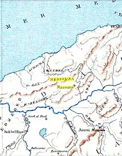En raison de divergences politiques, les Médiounas migrèrent d'abord vers Mazouna avant de s'établir définitivement au nord-est des Beni Zeroual. Selon Ibn Khaldoun, ils sont frères des Maghila et des Matmata de Ould Fez, leur territoire se trouvait autour de Tlemcen, entre les montagnes de Beni Rached et d'Oujda, limitrophes des tribus des Lumya, Banou Ifren, Meknassas, Koumia et Ulhasa, repensant ainsi un groupe berbère influant à travers tout le Maghreb[2],[3].