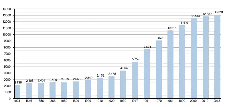 Graphe de l'évolution de la population de la commune. Les données ci-après intègrent les anciennes communes dans les données avant la fusion en 1977.