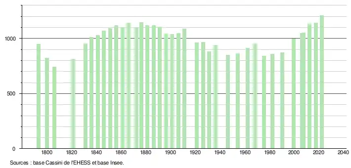 | L'évolution du nombre d'habitants est connue à travers les recensements de la population effectués dans la commune depuis 1793. Pour les communes de moins de 10 000 habitants, une enquête de recensement portant sur toute la population est réalisée tous les cinq ans, les populations de référence des années intermédiaires étant quant à elles estimées par interpolation ou extrapolation[23]. Pour la commune, le premier recensement exhaustif entrant dans le cadre du nouveau dispositif a été réalisé en 2007[24]. En 2022, la commune comptait 1 206 habitants[Note 2], en évolution de +5,7 % par rapport à 2016 (Landes : +5,78 %, France hors Mayotte : +2,11 %). |