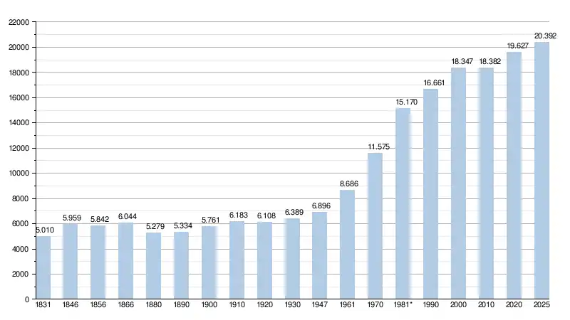 Les chiffres des années 1831 à 1970 tiennent compte des chiffres des anciennes communes fusionnées.