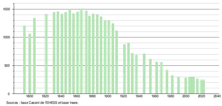 L'évolution du nombre d'habitants est connue à travers les recensements de la population effectués dans la commune depuis 1793. Pour les communes de moins de 10 000 habitants, une enquête de recensement portant sur toute la population est réalisée tous les cinq ans, les populations de référence des années intermédiaires étant quant à elles estimées par interpolation ou extrapolation[15]. Pour la commune, le premier recensement exhaustif entrant dans le cadre du nouveau dispositif a été réalisé en 2004[16].