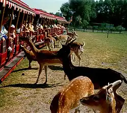 - Tuf-Tuf Express. Un train à vapeur permet une promenade tranquille à travers le parc entre les chevreaux et les cerfs en liberté à partir de 1983 est toujours en activité sous le nom de Plopsa Express. Du constructeur Chance Rides, il s'agit d'une réplique à voie étroite (610 mm) du C. P. Huntington (en)[53]. Les passagers peuvent acheter des biscuits pour nourrir les animaux, qui s'approchent volontiers lors de l'arrêt du train sur le parcours, ce qui renforce l'un des deux thèmes de prédilection du parc : le règne animal. Le train traversait également un tunnel dans lequel était reconstitué un petit village de type Far-West animé d'automates. Cette attraction évolua : le village devint hors service puis disparut et le parcours s'agrandit en 1990 pour faire le tour du parc.