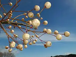 Le fruit est une drupe globuleuse à mince enveloppe charnue sphérique de 1–3 cm de diamètre d'abord vert pomme puis jaune-crème à maturité suspendue sur l'arbre tout l'hiver et persistant jusqu'à la floraison suivante en devenant de plus en plus ridée et presque blanche. Le noyau de la drupe est blanc sale, côtelé dans le sens de la longueur, avec un petit trou au centre apical. Il contient trois à six petites graines brunes ressemblant à des pépins de pomme.