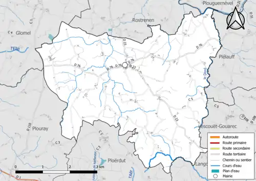 La commune est située dans le bassin Loire-Bretagne. Elle est drainée par le canal de Nantes à Brest, le Scorff, le Doré[5] et le Restmenguy[6],[7],[Carte 1].