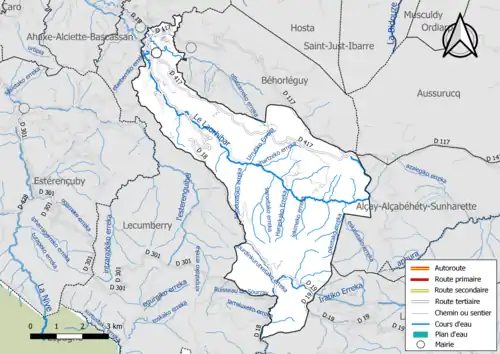 Ses terres sont arrosées[14] par un affluent de la Nive, le Laurhibar, et par ses tributaires, l'Esteneko erreka (ainsi que par l'affluent de celui-ci, l'Olhazarréko erreka), le Chorotako erreka (ainsi que par le tributaire de celui-ci, le Gahalarbeko erreka), le Sainduchiloko erreka, le Larreluchéko erreka, l'Etcheberriko erreka, l'Oihartzéko erreka, le Lékiméko erreka, l'Urrutiko erreka, l'Haraskako erreka, l'Arbaretcharbaretchéko erreka, le Curutchetako erreka et l'Escalérako erreka ainsi que par le tributaire de ce dernier, le Pikettako erreka.