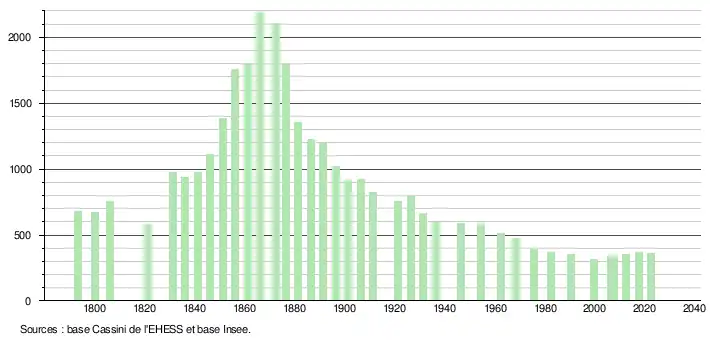 L'évolution du nombre d'habitants est connue à travers les recensements de la population effectués dans la commune depuis 1793. Pour les communes de moins de 10 000 habitants, une enquête de recensement portant sur toute la population est réalisée tous les cinq ans, les populations de référence des années intermédiaires étant quant à elles estimées par interpolation ou extrapolation[26]. Pour la commune, le premier recensement exhaustif entrant dans le cadre du nouveau dispositif a été réalisé en 2007[27].
