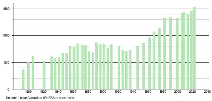 L'évolution du nombre d'habitants est connue à travers les recensements de la population effectués dans la commune depuis 1793. Pour les communes de moins de 10 000 habitants, une enquête de recensement portant sur toute la population est réalisée tous les cinq ans, les populations de référence des années intermédiaires étant quant à elles estimées par interpolation ou extrapolation[25]. Pour la commune, le premier recensement exhaustif entrant dans le cadre du nouveau dispositif a été réalisé en 2008[26].