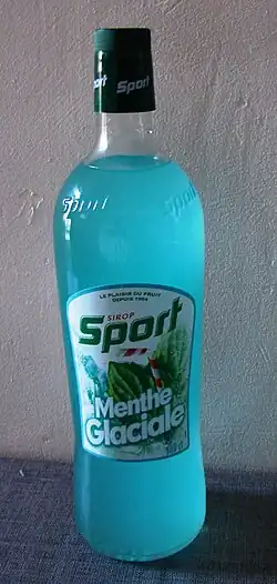 La menthe glaciale est un sirop de menthe aromatisé au menthol, parfois artificiellement coloré en bleu pâle.