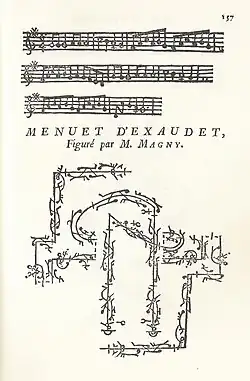 L'un des plus populaires fut le « menuet d'Exaudet » composé par le violoniste André-Joseph Exaudet et chorégraphié en 1765 par Claude Magny. Il est extrait des six sonates en trio à deux violons et basse opus 2 publiées à Paris en 1751. L'air a servi de timbre à plus de deux cents chansons de tous styles et la danse était encore pratiquée au début du XXe siècle.