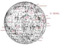 La nomenclature traditionnelle des noms lunaires possède également un « oceanus » (l'océan des Tempêtes, la plus grande des mers lunaires, faisant plus de 2 500 kilomètres selon son axe nord-sud et une superficie d'environ 2 millions de kilomètres carrés[8]), ainsi que des lieux dénommés « lacus » (lac), « palus » (marais) et « sinus » (baie). Les trois derniers sont plus petits que les maria, mais sont de même nature et ont les mêmes caractéristiques[9].
