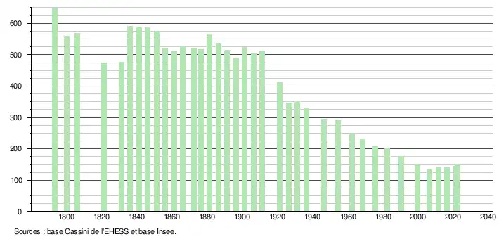 L'évolution du nombre d'habitants est connue à travers les recensements de la population effectués dans la commune depuis 1793. Pour les communes de moins de 10 000 habitants, une enquête de recensement portant sur toute la population est réalisée tous les cinq ans, les populations de référence des années intermédiaires étant quant à elles estimées par interpolation ou extrapolation[18]. Pour la commune, le premier recensement exhaustif entrant dans le cadre du nouveau dispositif a été réalisé en 2006[19].